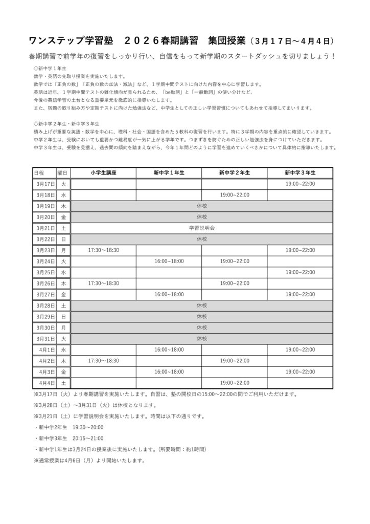 新学年に向けて、今までの総復習とスタートダッシュを切る大切な期間です。